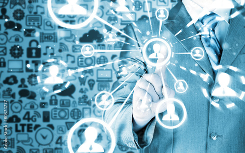 man hand pressing social media icon