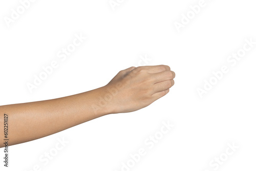 Man hand show holding something like a bottle isolated on white background. Clipping path included
