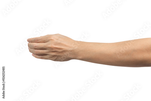 Man hand show holding something like a bottle isolated on white background. side view. Clipping path included