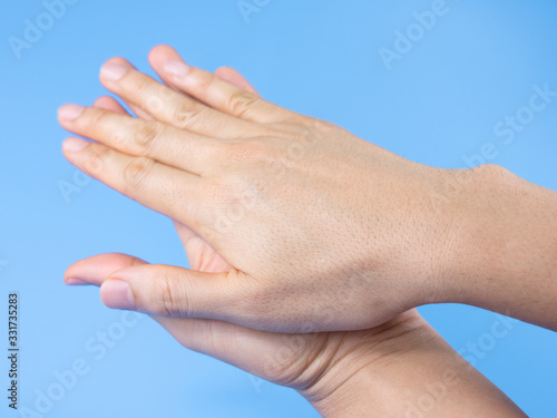 Man hand wash by sanitizer, alcohol gel for prevention coronavirus, bacteria and germ on blue background, health care concept.