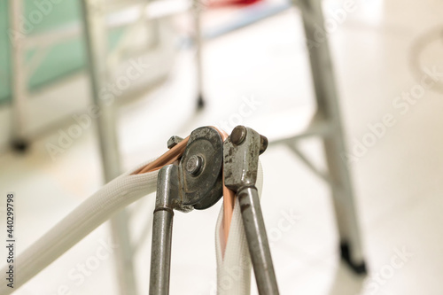 Man hands bends copper pipes by pipe bender. Air conditioner technician hands bends copper pipes by pipe bender. Pipe bender tool in a hands of factory worker on Site. Fitter is bending a pipe.
