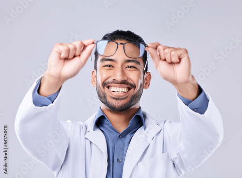 Man hands, glasses and portrait of ophthalmologist at studio isolated on a white background. Frame, spectacles and happy face of optometrist, optician and doctor with vision lens, health and wellness