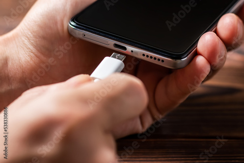 Man hands plugging a charger in a smart phone. Man using smartphone with powerbank.