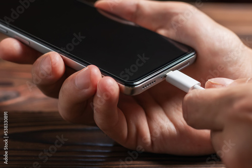 Man hands plugging a charger in a smart phone. Man using smartphone with powerbank.