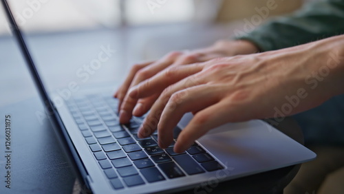 Man hands typing keyboard of laptop in light office closeup. Guy fingers working