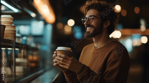 man having a coffee, LATE NIGHT, inside convienence store smiling, modern light, modern
