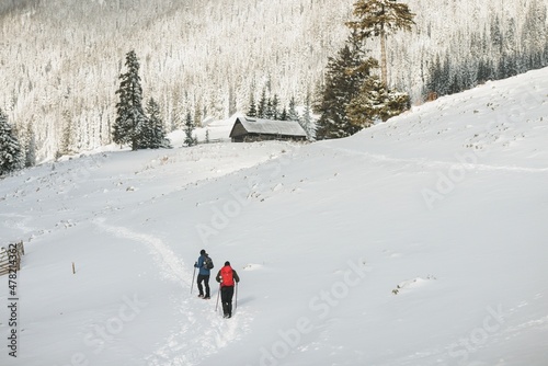 Man hiker with backpack trekking in mountains. Winter sport activity snow mountain hills. Winter hiking cold weather with backpack on snow trail forest in Carpathian evergreen coniferous trees