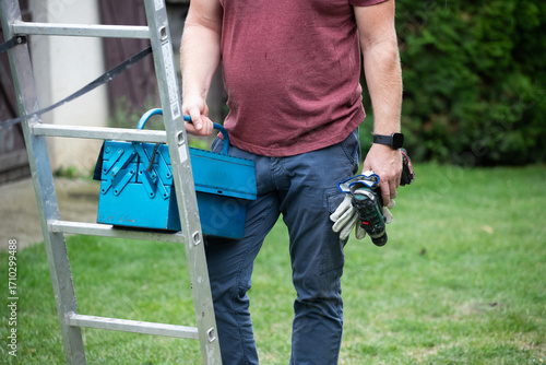 Man holding a blue tool box
