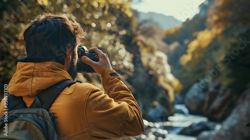 Man holding a camera taking pictures of nature 50mm f/1.8 lens, f/5.6 aperture, ISO 100 and natural light, half body photograph, realistic textures .generative ai