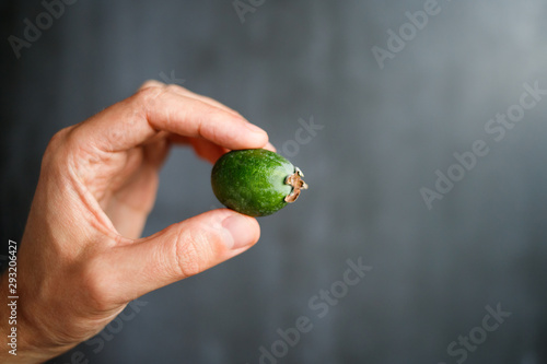 Man holding and showing ripe feijoa berry, black stone background with copy space, soft focus. High iodine content in feijoa, recommended for use in atherosclerosis, vitamin deficiency, gastritis
