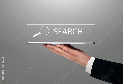 Man holding digital tablet with search symbol