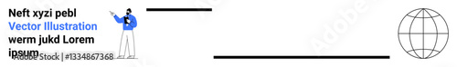 Man holding document beside globe illustration and text elements, emphasizing communication, education, technology, business, global reach, digital presentation, and simple landing page