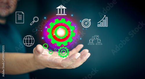 Man holding icons of business information technology icon. Big data connection, communication storag