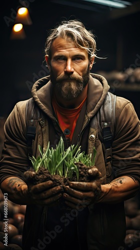 Man holding jade house plant in greenhouse. Agriculture plants illustration. Generative AI