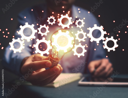 Man holding light bulb and gears mechanism. Concept of Idea, Imagination, Creativity