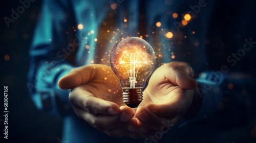Man holding light bulbs, ideas of new ideas with innovative technology and creativity. concept creativity with bulbs that shine glitter.