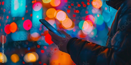 Man holding mobile phone, on Colour blurred futuristic bright background,