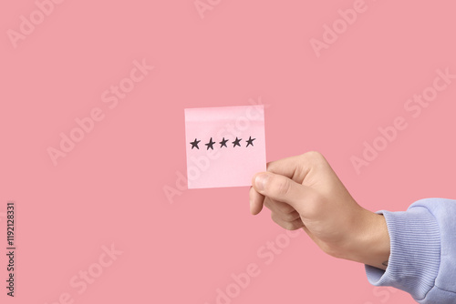 Man holding paper with rating stars on pink background. Survey concept