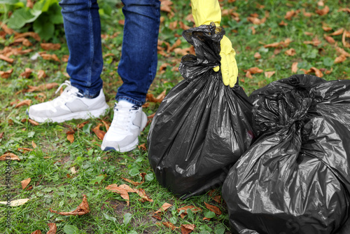 Man holding plastic bags with garbage in park, closeup.