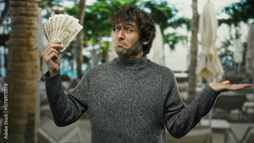 Man holding russian roubles standing on a city terrace outdoor, exuding a confident and contemplative vibe, capturing the essence of casual city life and financial themes.