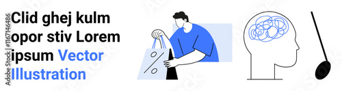 Man holding shopping bags with percentage sign. Side view of a human head with a complex brain illustration. Simple spoon icon. Ideal for retail, marketing, health, psychology, consumption
