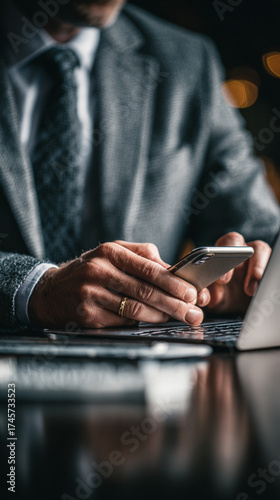 Man holding smartphone in modern office, checking emails and managing tasks, multitasking with laptop for productivity and project management.