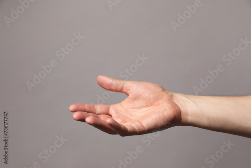 Man holding something in hand on grey background, closeup. Space for text