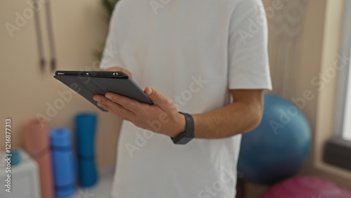 Man holding tablet in gym setting with exercise equipment indicating technology interaction in sports environment, wearing casual white shirt.