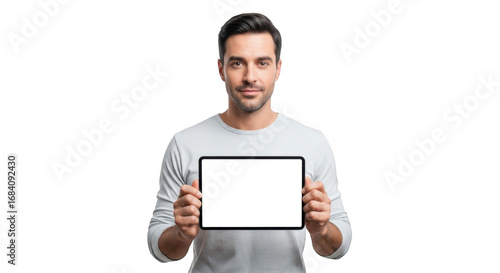 Man holding tablet mockup presentation blank screen digital device marketing advertising isolated black background on transparent background