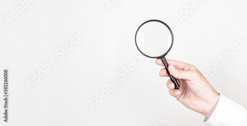 Man holds magnifying glass on wall background. Concept of search, recruitment and job search.