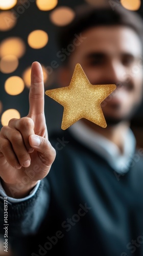 Man holds up a finger with a golden star decoration in a warm, softly lit environment during a celebration