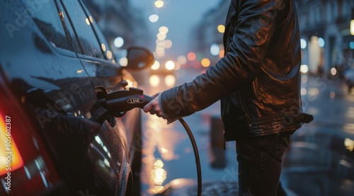 Man in a black leather jacket plugging an electric car into a charging station, closeup, blurred city background.