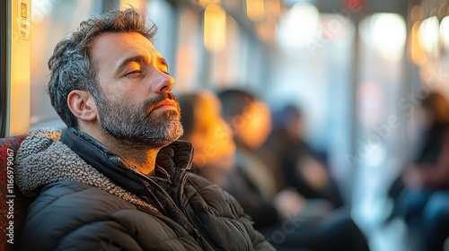 Man in a crowded train appears lost in thought during a commute surrounded by fellow passengers in soft evening light