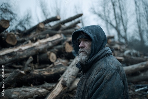 Man in a hooded jacket stands near a pile of logs during a cold, overcast day in late autumn Generative AI