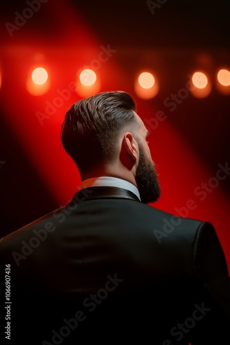 Man in a suit stands confidently under dramatic red lighting, highlighting his sleek hairstyle and tailored attire.