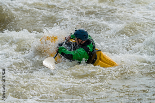 Man in a yellow kayak white water rafting