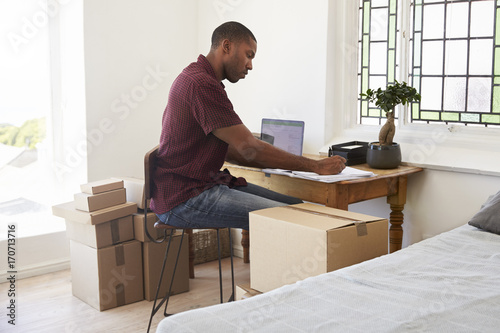Man In Bedroom Running Business From Home Labeling Goods
