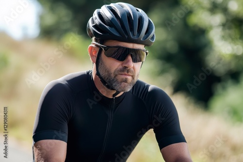 man in black cycling gear, wearing a helmet and sunglasses, on the road. He is wearing a plain jersey t-shirt