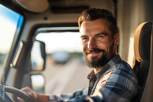 Man in blue and white plaid shirt sits in truck driver seat. He has a beard and is looking directly at camera. Truck is parked on road with clear blue sky and trees in background.