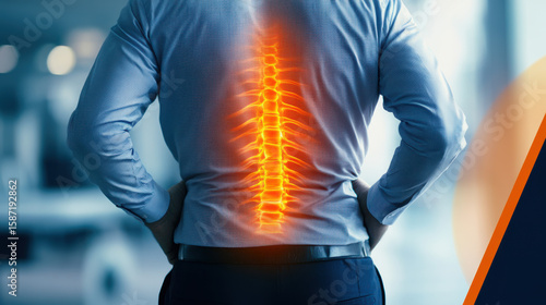 Man in blue shirt experiencing glowing red pain in his lower back with highlighted spine showing discomfort and injury