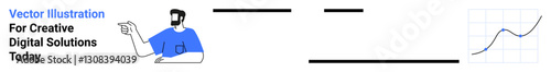 Man in blue shirt gesturing towards a graph with upward trend. Ideal for analytics, teamwork, strategy, presentation, marketing, business planning, and flat landing page banner
