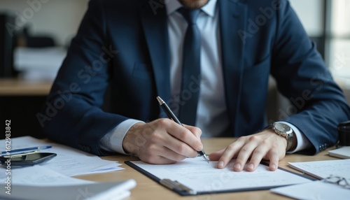 Man in blue suit, white shirt, black tie sits at desk signing document. Hand poised over paper, contemplating action. Desk clutter includes phone, pen, books suggesting busy work day.