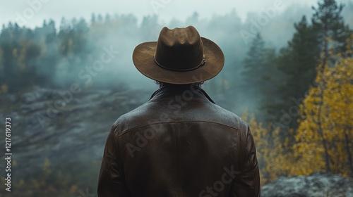 Man in brown hat and leather jacket gazing at misty forest landscape with autumn foliage and rocky terrain Copy Space