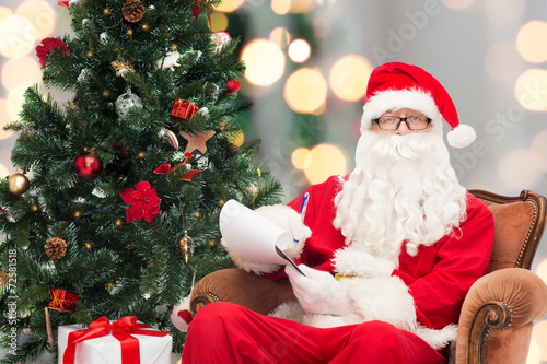 man in costume of santa claus with notepad