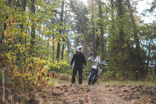 Man in dual sport helmet with backpack, enduro off road motorcycle on the forest road during sunrise. travel freedom concept