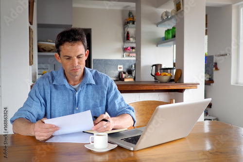 Man in home office reading a document