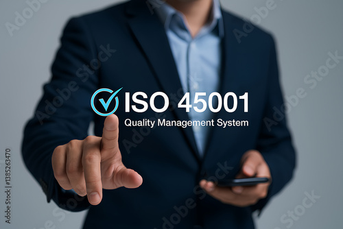 Man in navy suit pointing at ISO 45001 safety management system text with confidence.