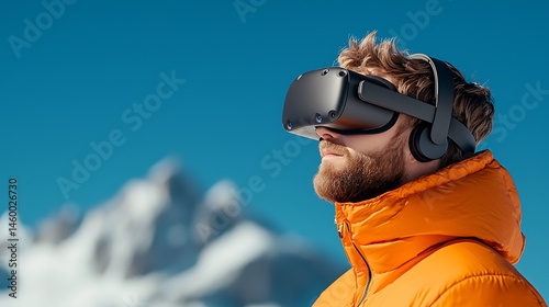 Man in Orange Jacket Using VR Headset Against Snowy Mountain Background