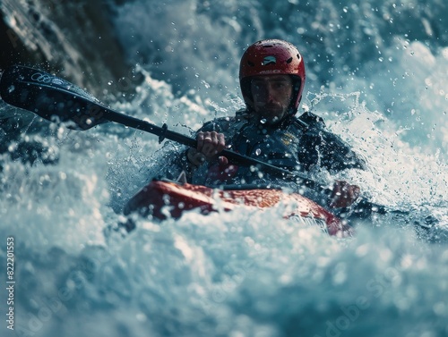 Man in red helmet kayaking in the river
