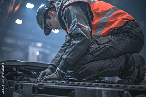 Man in safety vest fixing car engine, surrounded by tools and parts. Brightly lit garage background with toolboxes and mechanic's equipment.